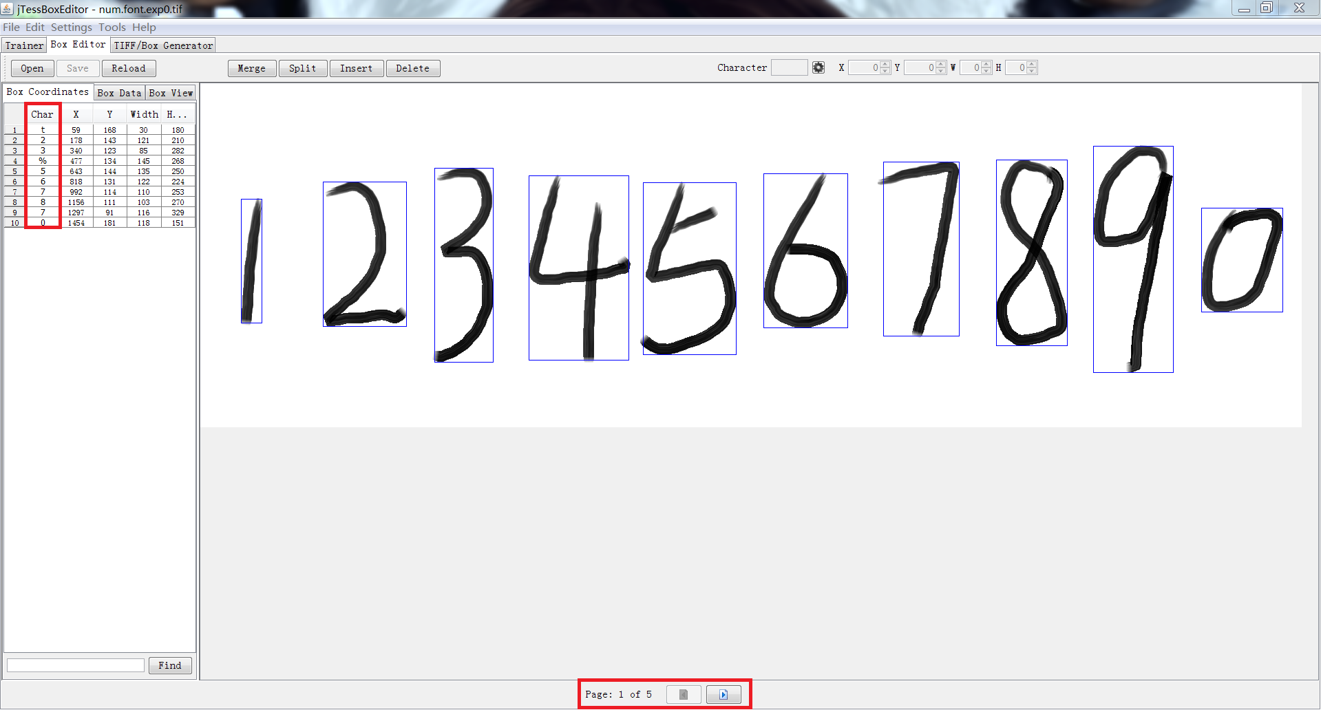 打开jTessBoxEditor,BOX Editor -> Open,打开num.font.exp0.tif;矫正<Char>上的字符,记得<Page>有好多页噢!