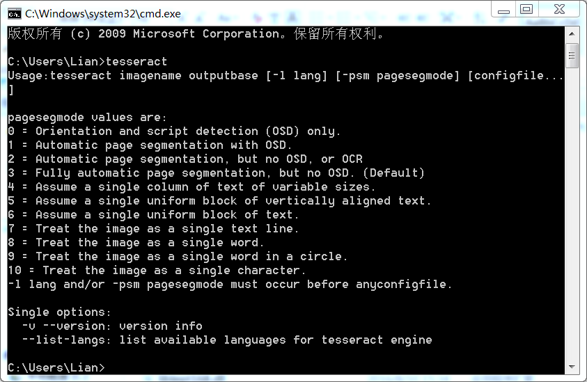 打开命令行,输入tesseract,回车;以下便是tesseract的大体面貌: