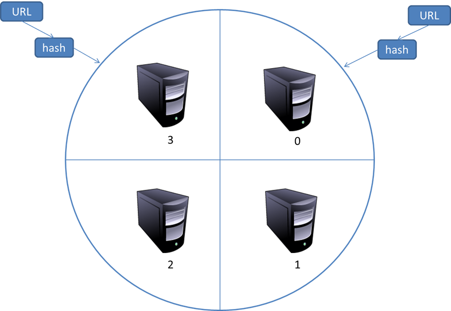 这种模式有一个问题,当有一台服务器死机或者添加新的服务器,那么所有URL的哈希求余的结果就都要变化。也就是说,这种方式的扩展性不佳。针对这种情况,又有一种改进方案被提出来。这种改进的方案是一致性哈希法来确定服务器分工。其基本结构如图所示: