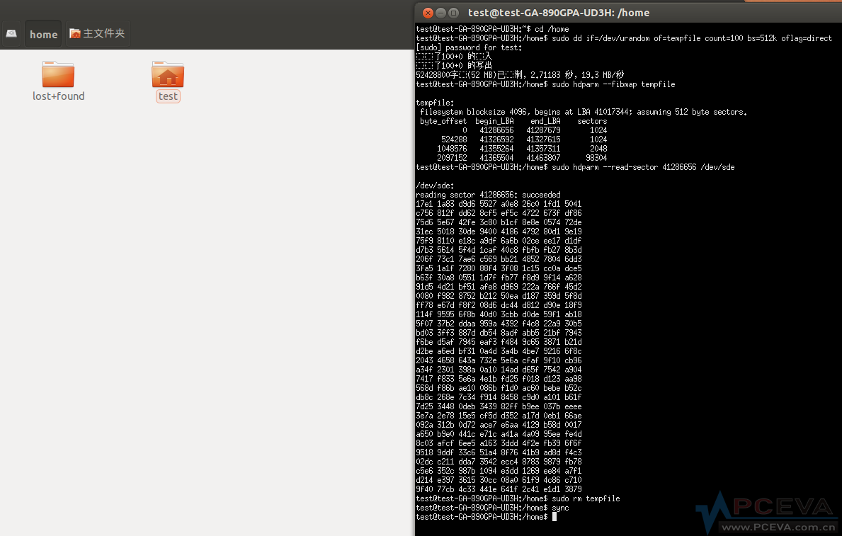 我们再输入以下2个命令以删除测试文件并要求系统同步向硬盘发出删除指令: