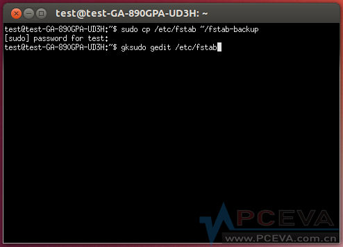 备份完毕我们就可以去修改fstab文件了,由于fstab是系统文件,如果直接在图形界面打开,是不允许编辑,因此我们需要用授权模式打开文件,在命令行界面输入以下命令: