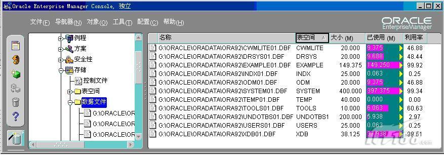 使用oracle enterprise manager console工具,这是oracle的客户端工具,当安装oracle服务器或客户端时会自动安装此工具,在windows操作系统上完成oracle安装后,通过下面的方法登录该工具:开始菜单——程序——Oracle-OraHome92——Enterprise Manager Console(单击)——oracle enterprise manager console登录——选择‘独立启动’单选框——‘确定’ —— ‘oracle enterprise manager console,独立’ ——选择要登录的‘实例名’ ——弹出‘数据库连接信息’ ——输入’用户名/口令’ (一般使用sys用户),’连接身份’选择选择SYSDBA——‘确定’,这时已经成功登录该工具,选择‘存储’ ——表空间,会看到如下的界面,该界面显示了表空间名称,表空间类型,区管理类型,以”兆”为单位的表空间大小,已使用的表空间大小及表空间利用率。