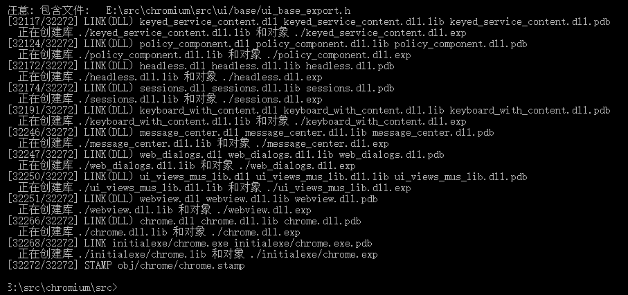 步骤七、编译生成可执行文件 执行 ninja -C out/Default chrome 编译,当然也可以在vs2017里面打开all.sln build编译