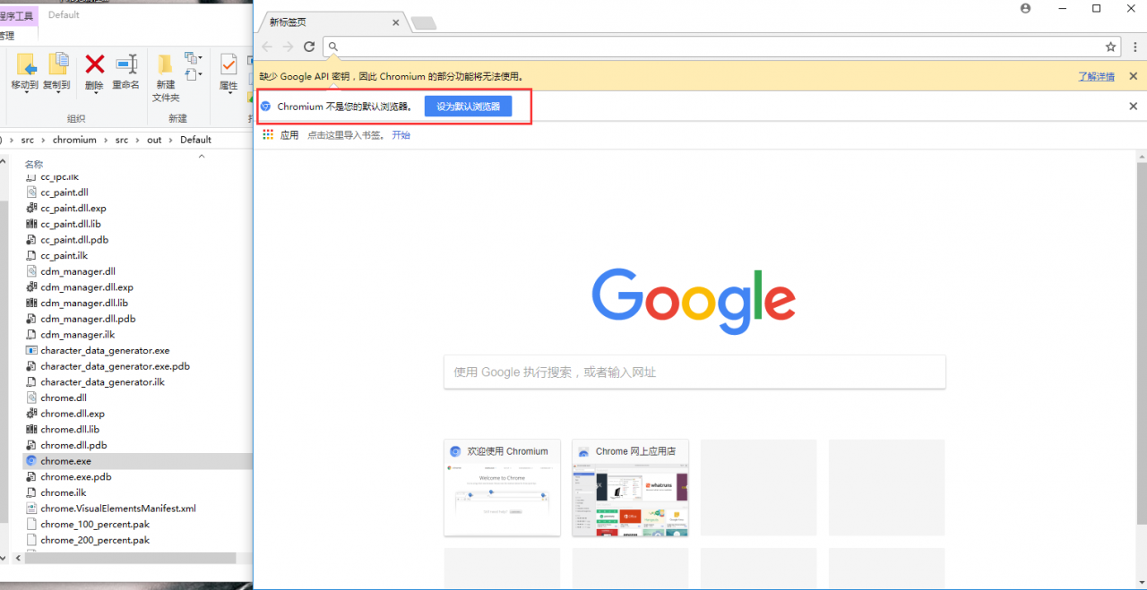 花了将近5个小时编译出来了 chrome.exe 不过又多出来了50多个G的编译临时文件,预留好空间哟。
