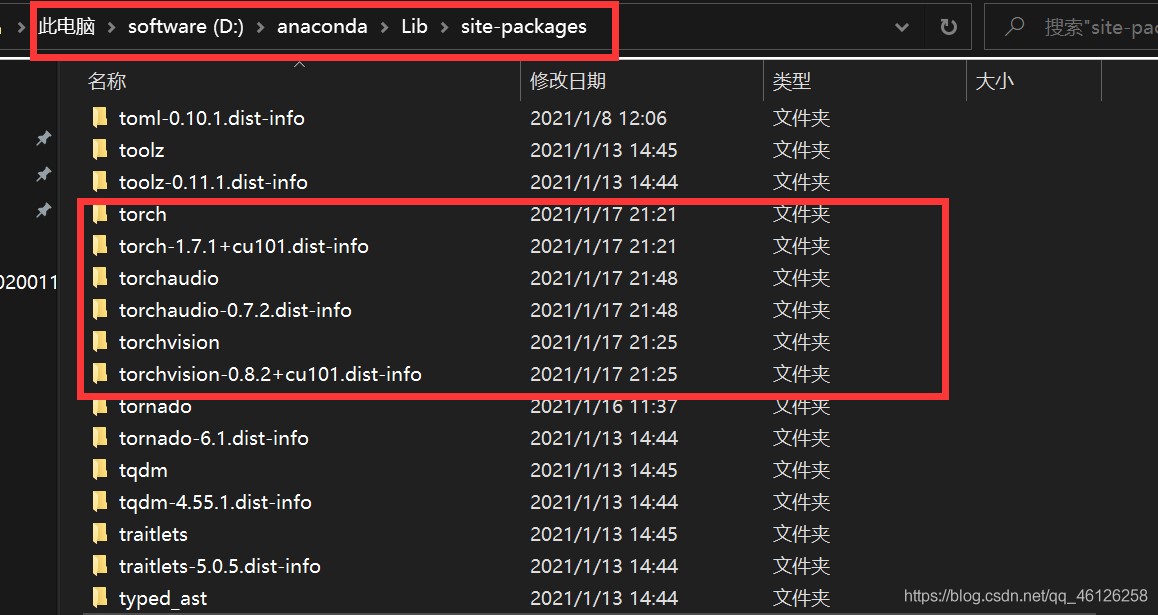 anaconda目录下的lib->site-packages,例如我的在D:\anaconda\Lib\sitepackages,删除torch和torch-1.1.1+cpu.dist.info(torch-1.7.1+cu101.dist-info中的+cu101表示CUDA10.1, + cpu表示CPU版本)