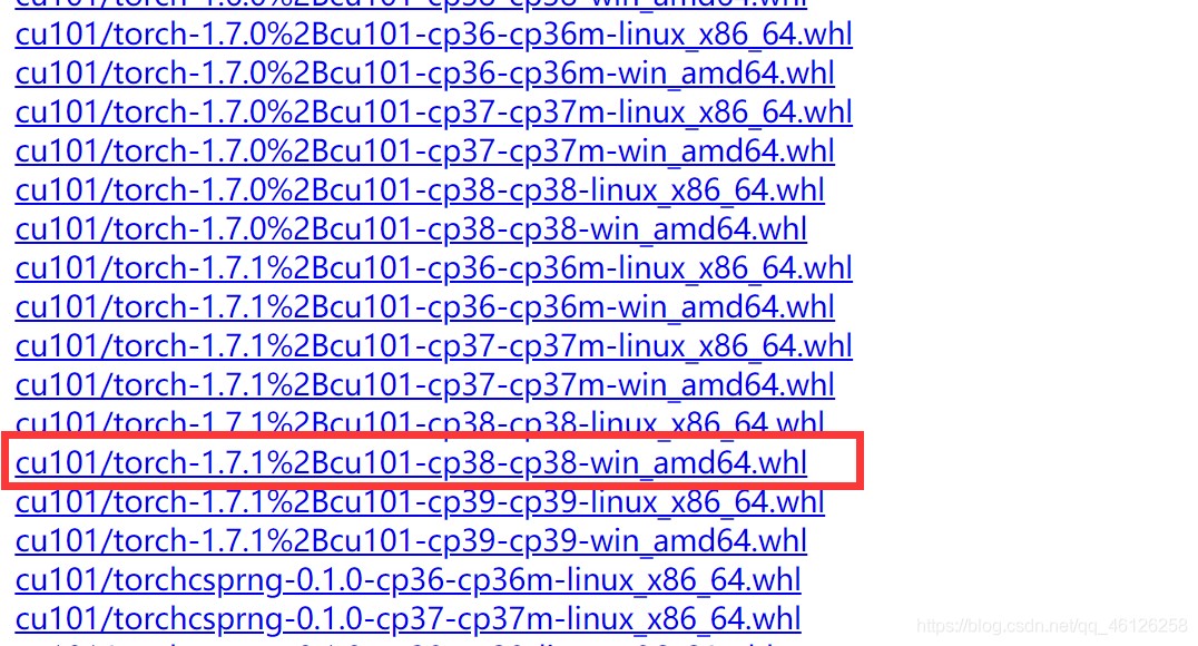 - 下载torch==1.7.1+cu101,可以观察到cu101/torch-1,7,1有很多的版本,cp38 对应python3.8,win_amd64对应windows的64位操作系统,根据自己的实际情况进行下载即可。