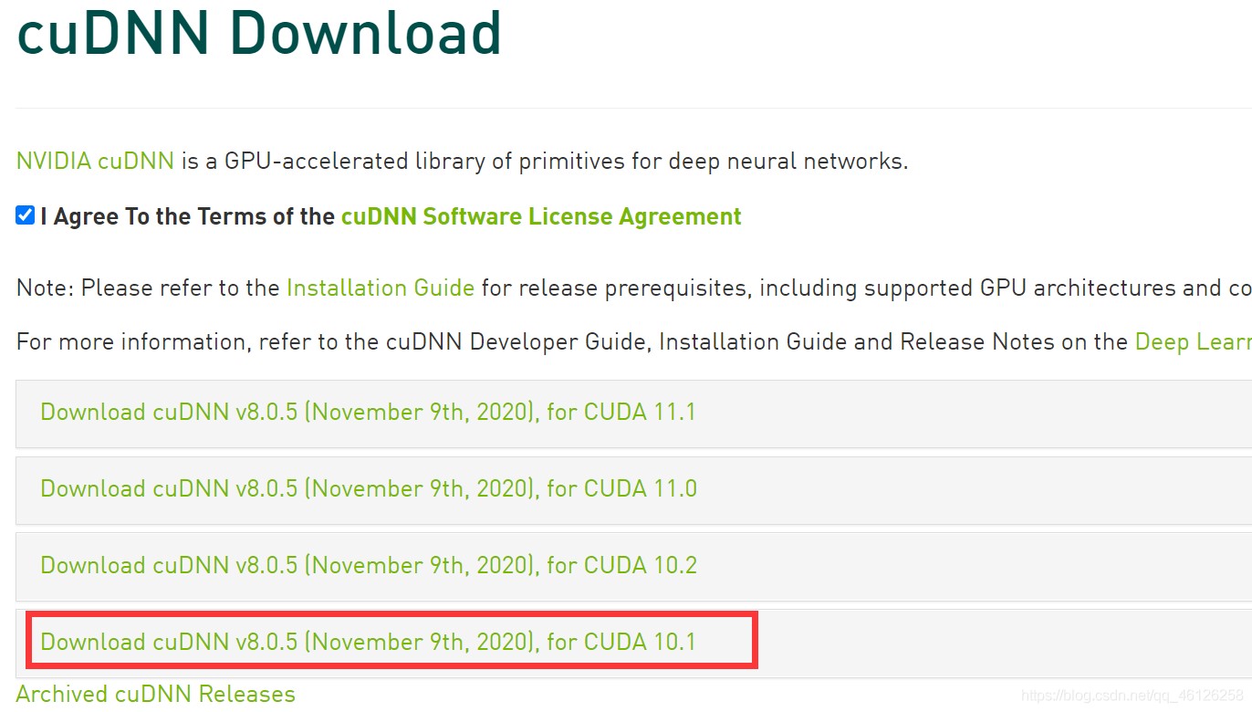 进入官网https://developer.nvidia.com/rdp/cudnn-download ,先注册登录,查看自己的CUDA版本号对应自己的cuDNN,如下:我的是CUDA10.1,所以对应cuDNN8.0.5